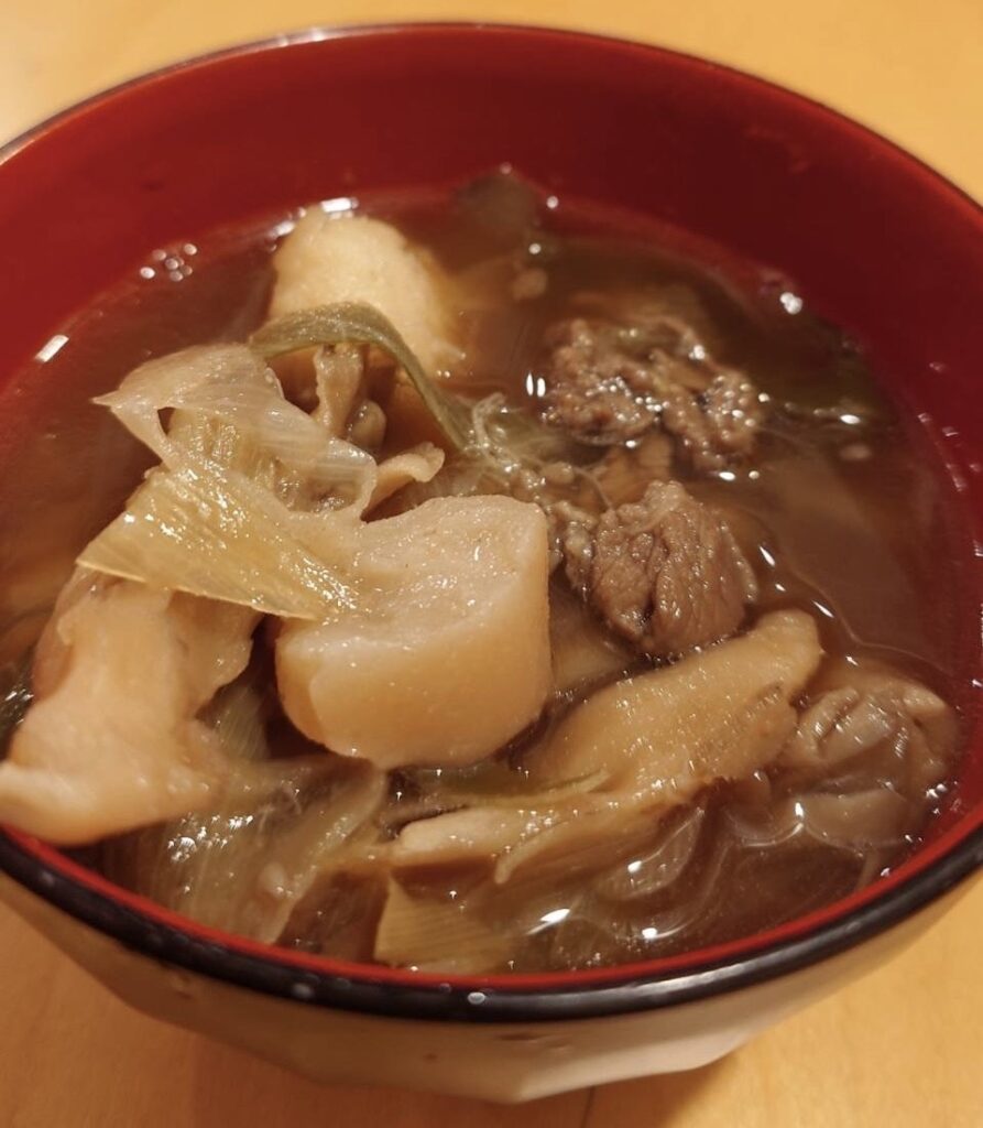 山形県の郷土料理。里芋、ねぎ、ごぼう、舞茸など野菜たっぷりの「芋煮」と、小麦粉生地を焼いてくる